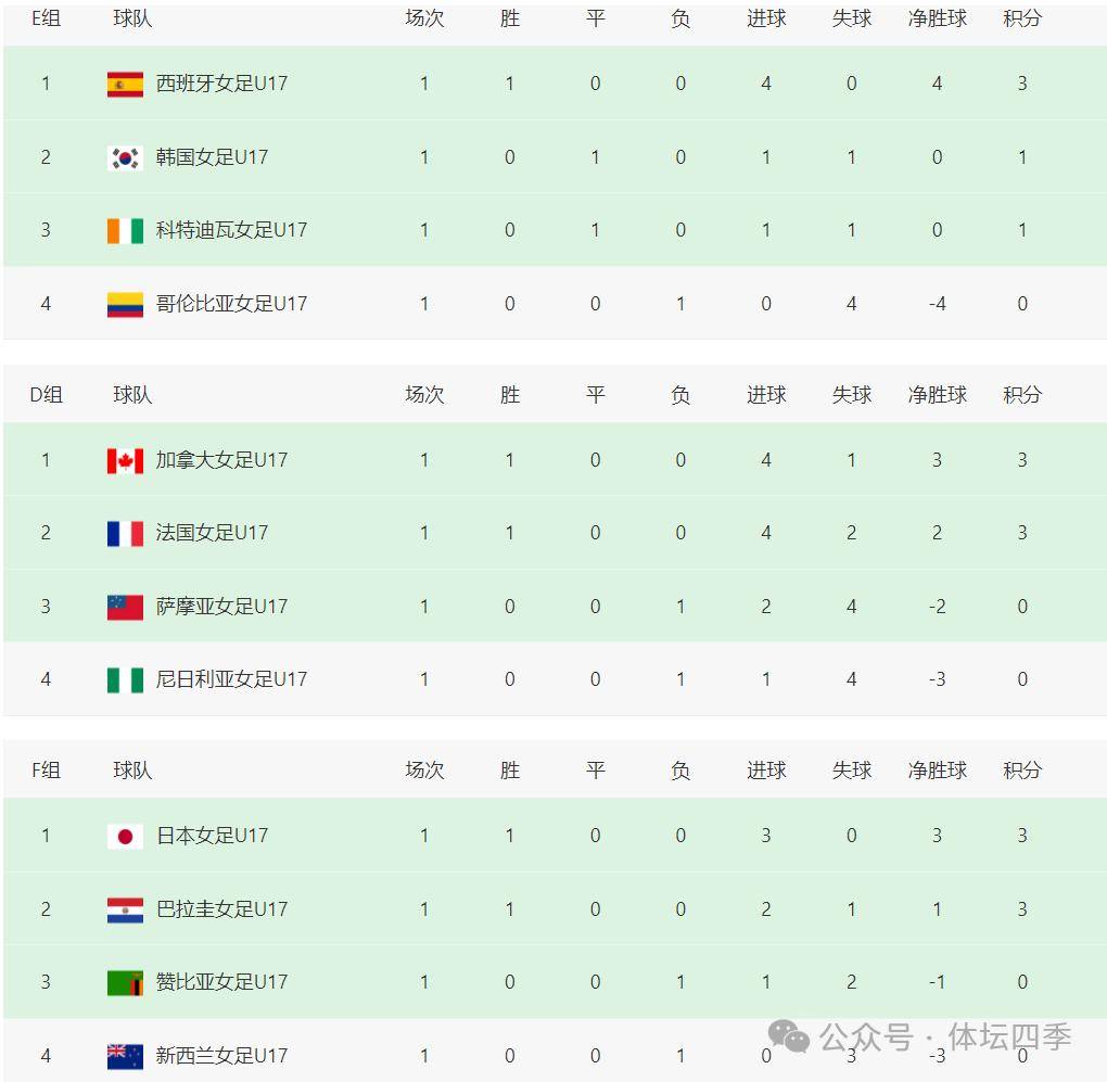 首轮比赛结束后,最新的积分榜情况如下:亚洲的四支队伍中,中国女足、日本队和朝鲜队均位列各自小组的榜首,韩国暂时排名小组第二,展现出强大的竞争力。欧洲方面,西班牙是唯一排名小组第一的球队。