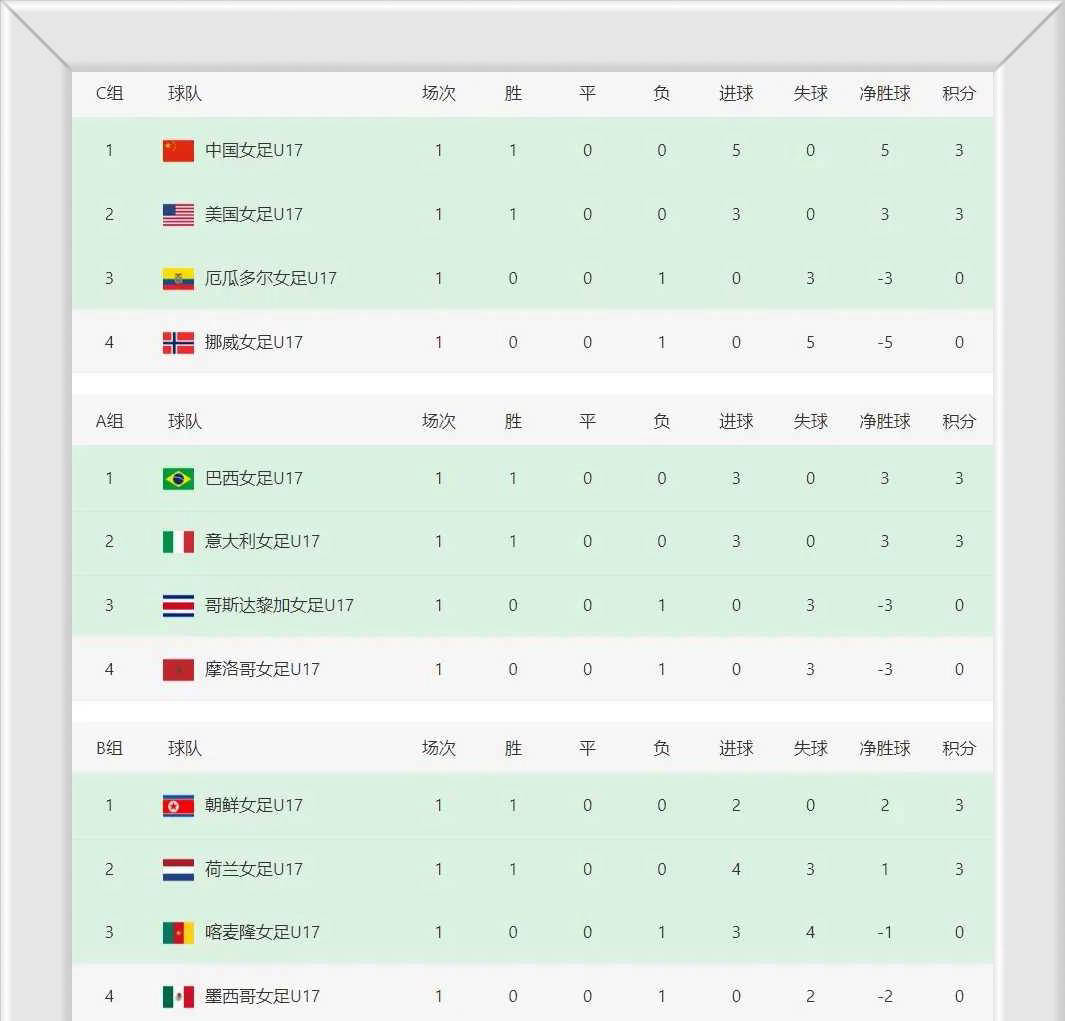 首轮比赛后,C组排名出炉,中国女足净胜球优势排名榜首,美国队紧随其后,厄瓜多尔和挪威队排在三四位。