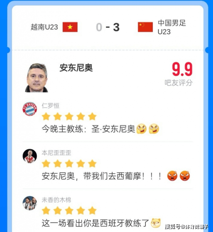 本场比赛的最大功臣,毫无疑问就是主教练安东尼奥了,被球迷戏称为大脚尼奥的这位主帅,用一战彻底改变了球迷对他的看法,赛后球迷也是打出了9.9分的高分,甚至有球迷期待他能够带队打进世界杯。